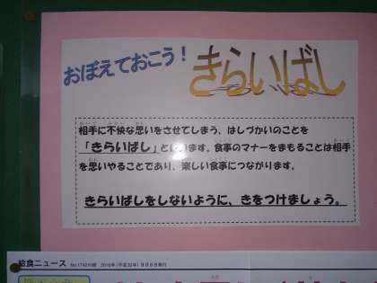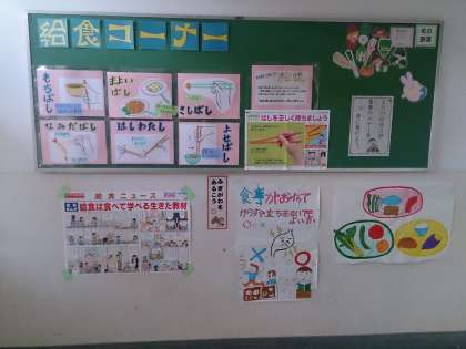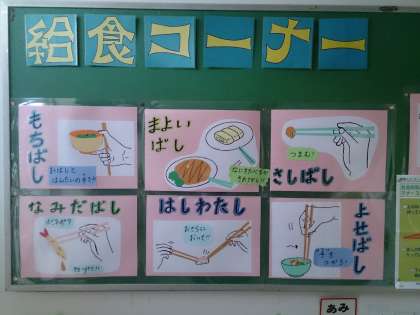 今回の給食掲示は、お箸の持ち方です。正しい使い方を覚えて、楽しく食事をしてほしいと思います。