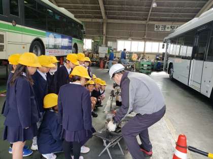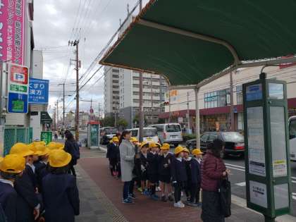 2年生がシテイバス守口車庫に社会見学。毛馬2丁目停留所から終点の守口車庫まで。