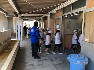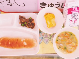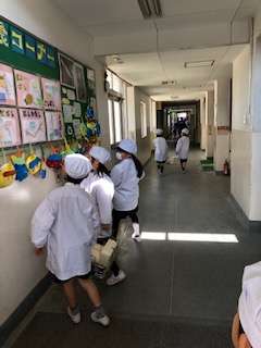 今日の給食は、牛肉のデミグラスソース煮、コーンスープ、かぼちゃのプリンです。写真は、3年生と1年生が給食掲示を見ながら、お友だちの給食当番を待つ様子です。
