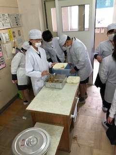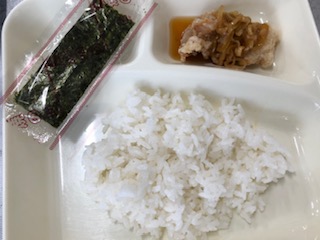 今日の給食は、あげ鶏のねぎソースかけ、あつあげとはくさいの中華煮、焼きのり、米飯牛乳です。写真は、6年生の配膳の様子です。