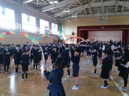 今日、卒業をお祝いする会がありました。各学年が6年生への合唱をしたり、6年生が、合唱、合奏したりして、6年生の卒業をお祝いしました。下の写真は、各学年の子どもたちが、みんなで書いた色紙をプレゼントしている様子です。