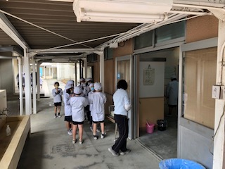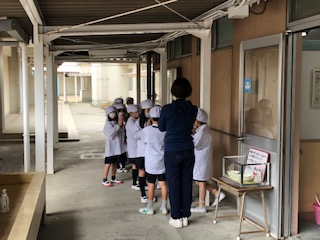 写真は、1年生と3年生がきちんと整列して、給食を運びに来ている様子です。子どもたちは、しっかり白衣を着て並んでいます。ちなみに、昨日の給食クイズの正解は、一番の七種類でした。