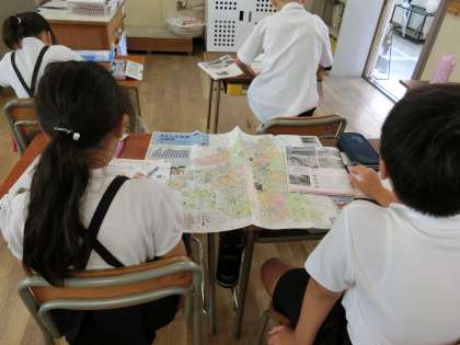 【写真下】3年生の社会科では、いよいよ「私たちの大阪市」の学習が本格的に始まりました。大阪市の地図を見ながら、大阪市のことを覚えていきます。