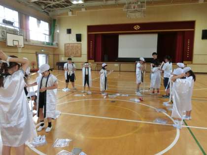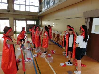1日には、まっさらの紅白のはっぴがみんなに配られました。初めてそのはっぴを着た子どもたちの表情は、きりっと引き締まっていました。