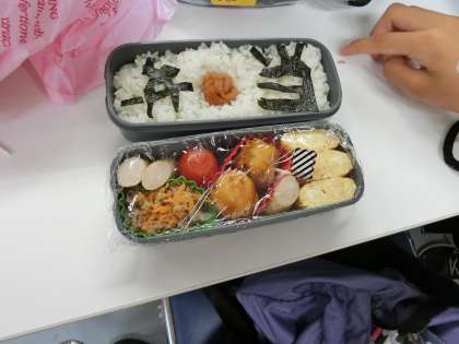 【写真下】「お腹が減ったよ!!!」楽しみにしていたお弁当の時間です。なんと、朝早く起きて、自分で「手作りのお弁当」を作ってきている子が何人かいて、心から感心しました。写真は、そのお弁当です。