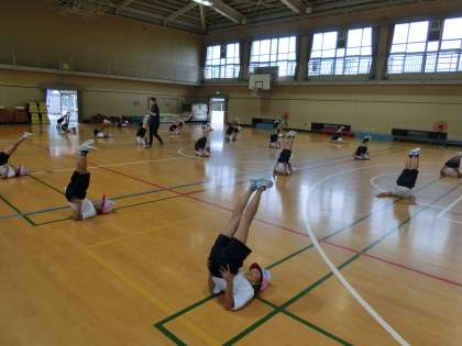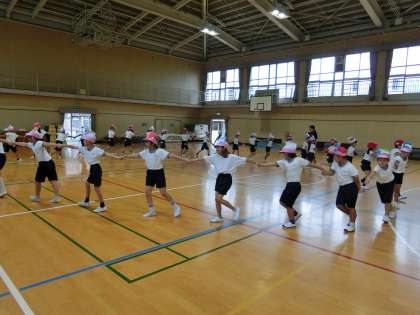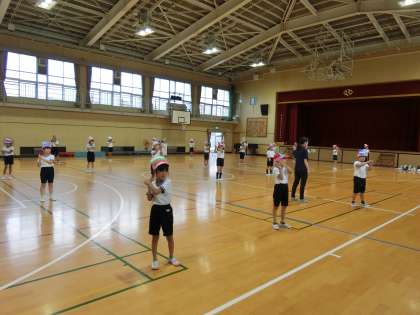 雨模様の中、運動場での練習ができませんでしたが、本校には広い体育館があるので、そこで練習を行うことができます。