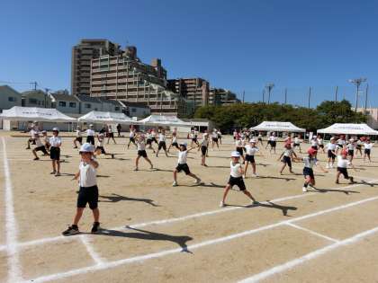 まさに快晴の秋晴れの中、1年生から6年生まで、「本番通りの動き」を練習しました。