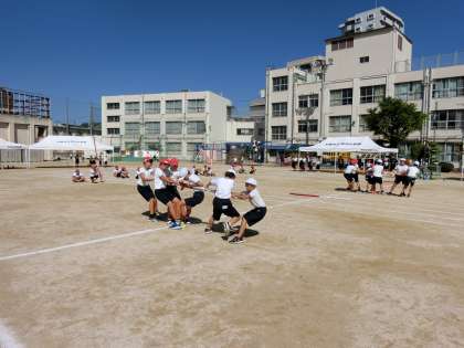 【写真中】5年生の「棒引き」の練習です。運動会の定番演技ですが、チームワークのいい5年生は、チームでいろいろな作戦を立てています。どんな戦いになるか、今から楽しみです。