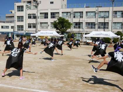 【写真下】6年生の「ソーラン節」の練習です。練習を重ねるごとに、動きに機敏さと真剣さが増しています。プログラムのラストを飾る演技に期待しています。