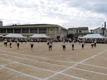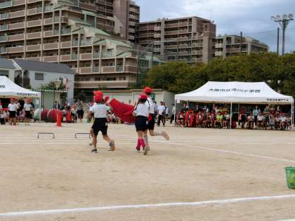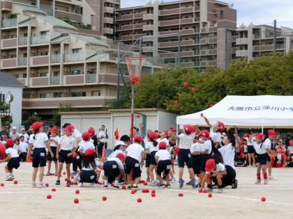 【写真下】運動会の定番の「玉入れ」です。今年は、かごの高さを上げていましたが、それでもたくさんの玉が入りました。