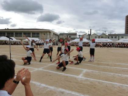 【写真上】5年生の団体競技でのダンスです。「学園天国」のBGMにのって、抜群のダンスが披露されました。さすが、踊りの得意な5年生です。