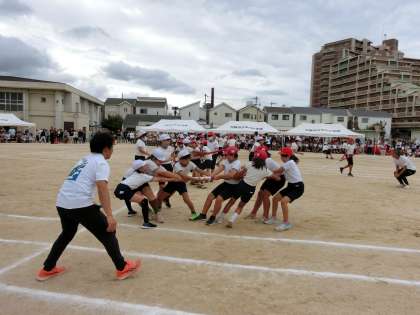 【写真中】5年生の団体競技「棒引き天国」です。両チームの、本気の戦いが繰り広げられました。最後まであきらめない5年生のスピリットが、とても印象的でした。
