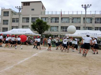 【写真下】全児童競技の「大玉送り」です。全校生で、一つのゲームを楽しむ良さを味わうことができました。