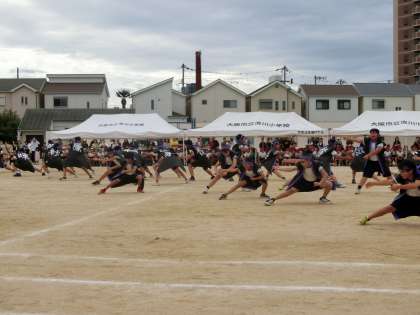 【写真中】最後を飾った6年生の「淀川ソーラン」です。6年生の気迫を、みんなが感じた演技でした。
