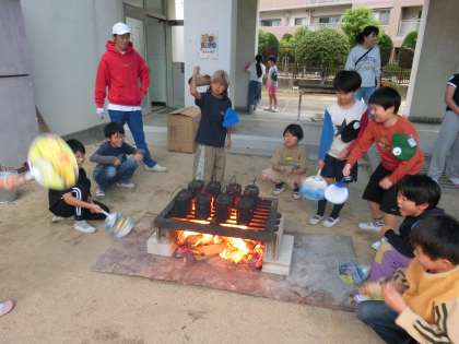【写真中】たくさんのお父さんたちが、子どもたちの飯盒の作業を助けてくれました。学校内で、飯盒すいさんの経験を積めるなんて、珍しい体験です。