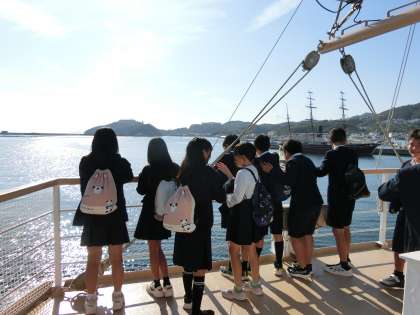 【写真上】いよいよ今日の一番楽しみなプログラムである「うず潮クルーズ」です。豪華な船が子どもたちの前に現れます。「えー、あんな船の乗れるの!!!」