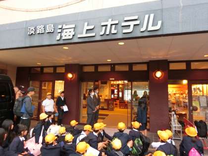 【写真上】今回の宿舎である「淡路島海上ホテル」に到着。政府登録国際観光旅館の称号を持つ歴史のあるホテルです。