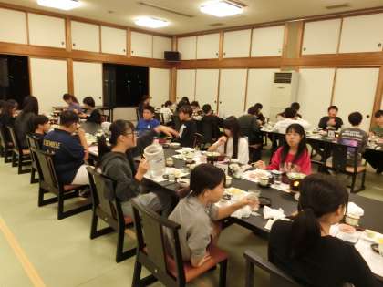 【写真中】楽しみにしていた修学旅行の夕食です。大広間は、とても大きな部屋で、子どもたちは、ゆったりと夕食を楽しみました。