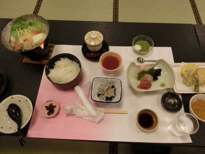 【写真下】今日の夕食メニューです。淡路島の新鮮な刺身や、玉ねぎ料理。鍋も豪華でした。私も何十回も修学旅行に行っていますが、食材の豪華さにびっくりしました。