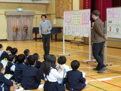 でも、子どもたちは「クリアーボイス」で、「アイコンタクト」しながら、英語での交流を楽しみました。