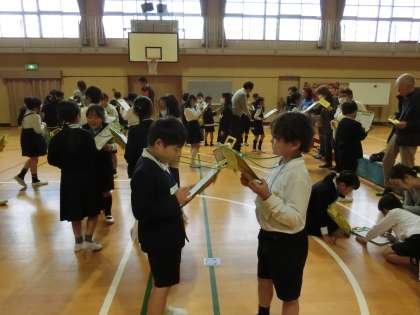 子どもたちは、クラスの友達や先生、地域のゲストティーチャーに、英語で次々にインタビューを行い、「コミュニケーション活動」を楽しみました。