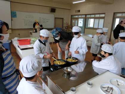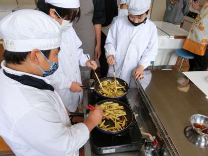 みんなは、先生に調理の仕方を教えてもらいながら、フライパンを使って「おいもスティック」を作りました。家庭科室には香ばしい匂いが立ち込め、いよいよ出来上がりです。