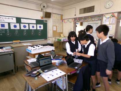【写真中】5年生の総合の授業です。「プログラミングでロボットを動かそう!」というテーマで、自分たちでタブレットを使いながらロボットを作りました。タブレットを使って、ロボットを左右前後に動かしたり、センサー感知でストップをかけたり、まさにロボット開発の授業でした。