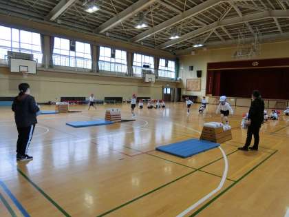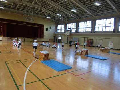 運動場で「なわとび」を行い、体育館では「跳び箱」を行っていました。
