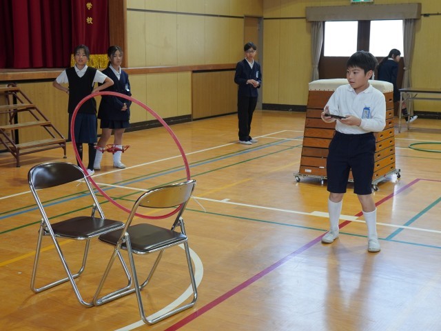 そしていよいよ操縦体験です。跳び箱やフラフープなどの障害物があるコースをコントローラーを使って操縦します。みんな最初は緊張した様子でしたが、ドローンが実際に飛ぶと「うわぁ~飛んだ!」「すごい!」「速い!」など歓声を上げながら操縦していました。