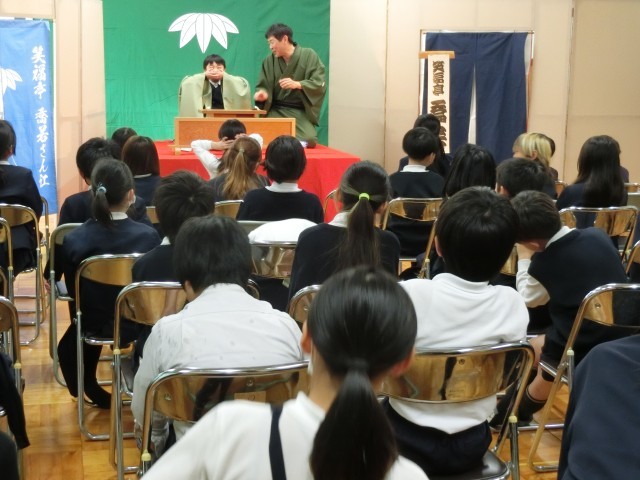 落語は、江戸時代の日本で成立し、現在まで伝承されている伝統的な話芸です。本校では、令和3年度に本校のPTA会長をお勤めくださった、笑福亭喬若(しょうふくていきょうじゃく)様のご厚意によりまして、毎年4年生を対象に一流の話芸を披露していただいています。今回で6回目となりました。
