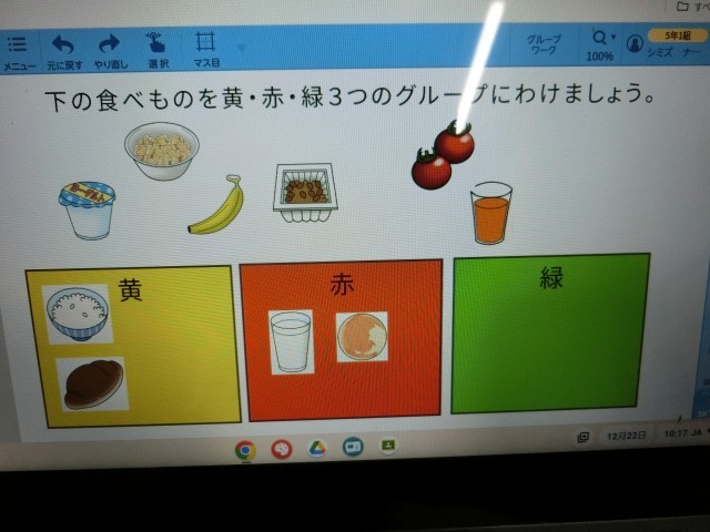 タブレットを使うのが得意な子どもたちは、「発表ノート」というアプリを使いながら、食品の分類を行っていました。