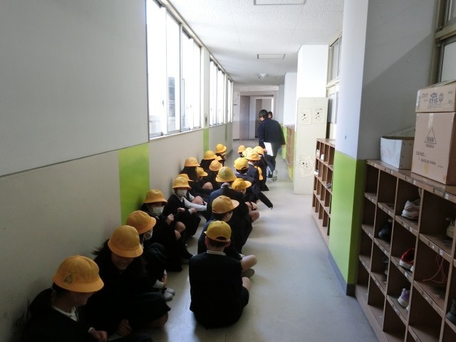 子どもたちは、地震直後に机の下に隠れたり、地震がおさまった瞬間をねらって運動場に避難する訓練を行いました。