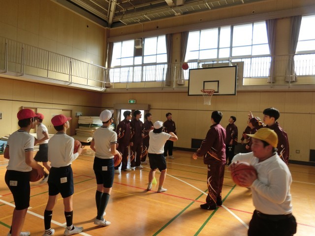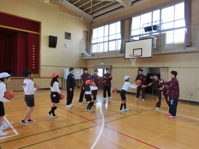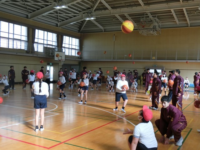 体育館ではバスケットボールが行われ、桜高の40人近いみんなは、一生懸命に6年生にバスケットボールを教えてくれました。