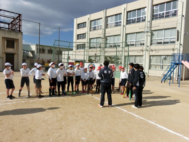 本日、桜宮高校の「バスケットボール部」と「ソフトボール部」の生徒たちが、淀川小学校に交流活動のために来てくれました。
