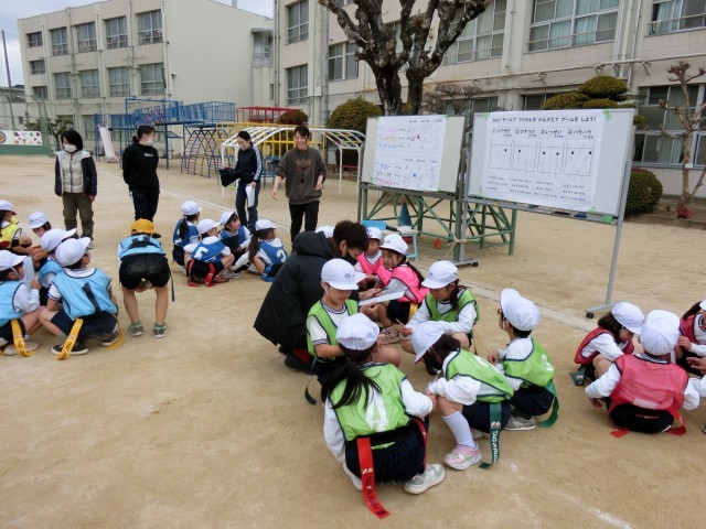 鬼あそびを通して、楽しみながら走る喜びを体感し、誰とでも仲良く遊べるようになることを目標に行われた授業です。