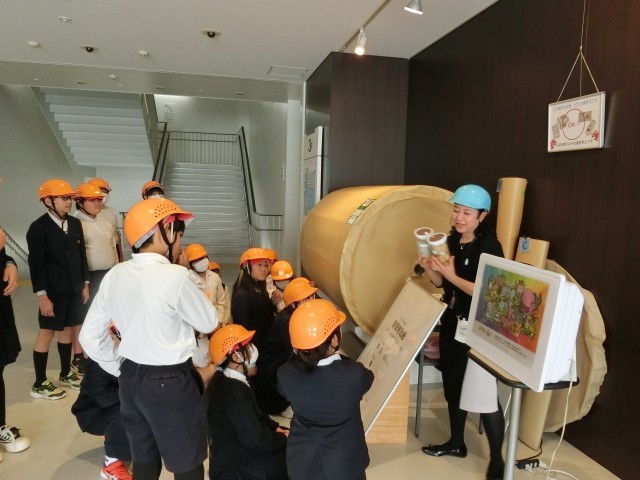 次に新聞に使われている巻取紙の見学です。目の前に巨大な巻取紙が現れ、「でかい!」と驚き、重さが1.3トンあることや長さが19キロあることを聞いて、また驚いている様子です。