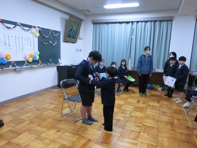 それから、卒業していく6年生に、在校生のみんなからのメダルや寄せ書きが手渡されました。