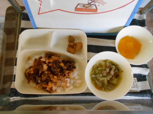 今日は「卒業祝い献立」でした。卒業祝い献立は、6年生の卒業をお祝いする気持ちがこめられた献立です。子どもたちに人気のフライドポテトやゼリー、牛肉の入った豪華なケチャップライスが登場しました。