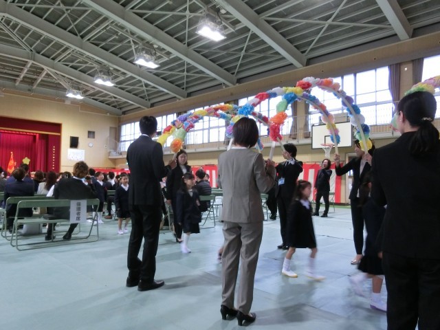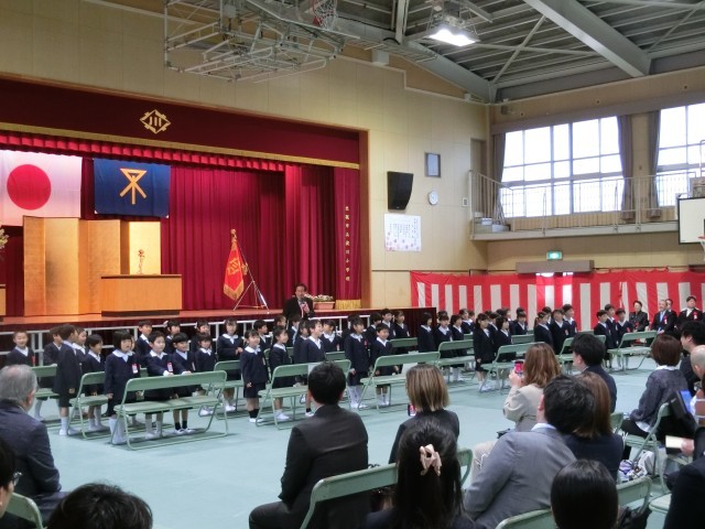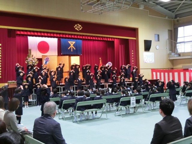 そして行われた入学式・・・。新1年生は、緊張した顔で大きな体育館に入ってきました。