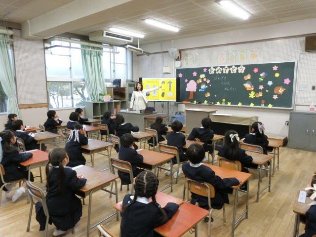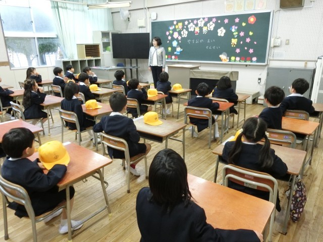 綺麗な掲示物が飾られた教室で、子どもたちは担任の先生の話を聞きました。