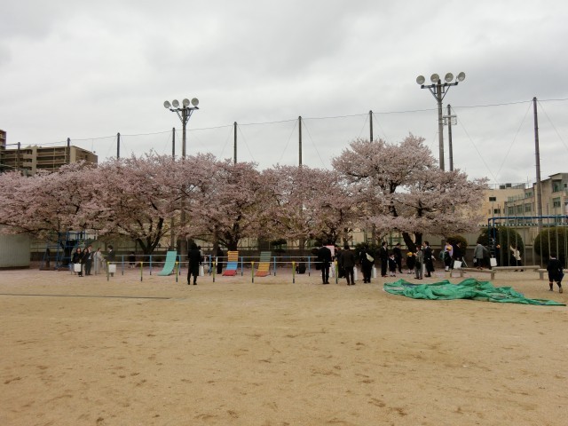 運動場の満開の桜の下には、綺麗な「桜色のじゅうたん」ができていました。