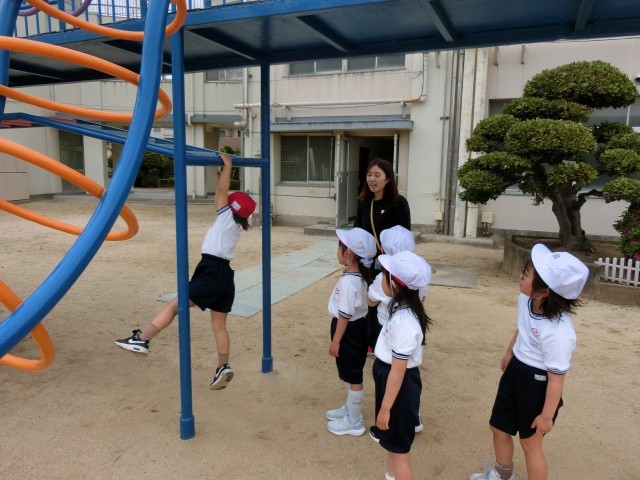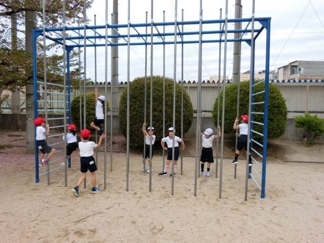 ジャングルジムの一番高いところに登ったり、上り棒をどんどん上に登ったり、子どもたちは新しい体験をたくさん楽しみました。