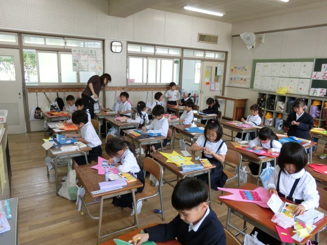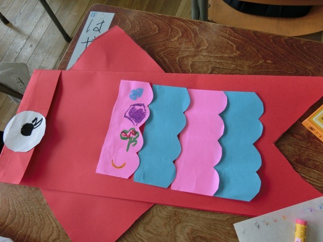 授業参観の続きで、子どもたちは「自分だけのこいのぼり」を楽しそうに作っています。