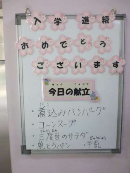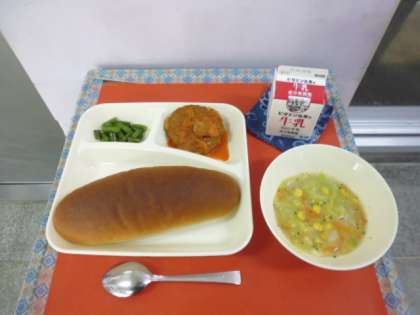 ★4月10日(水)の給食は、  ・煮込みハンバーグ  ・コーンスープ  ・三度豆のサラダ  ・黒糖パン  ・牛乳です。