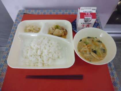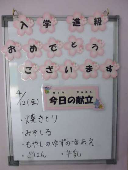 ★4月12日(金)の給食は、 ・焼き鳥 ・みそ汁 ・もやしのゆずの香あえ ・ごはん ・牛乳です。