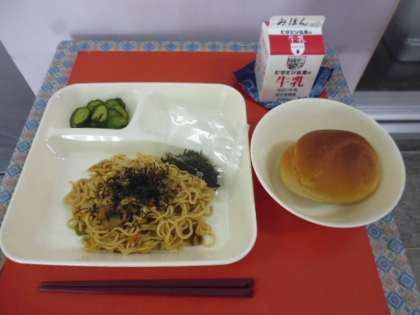 ★4月15日(月)の給食は、 ・焼きそば ・きゅうりのしょうがづけ ・1/2黒糖パン ・牛乳です。