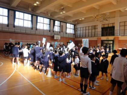 毎週、木曜日は児童集会を予定しています。今日は、1〜6年生で縦割り班になり集会委員会が作ったクイズをしました。異年齢の集団で、1年通して楽しく活動していきます。