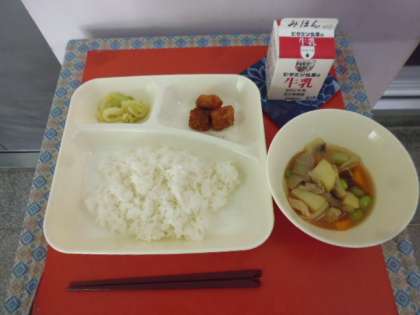 ★4月18日(木)の給食は、 ・まぐろのオーロラ煮 ・じゃがいもと野菜の含め煮 ・キャベツの梅風味 ・ごはん ・牛乳です。