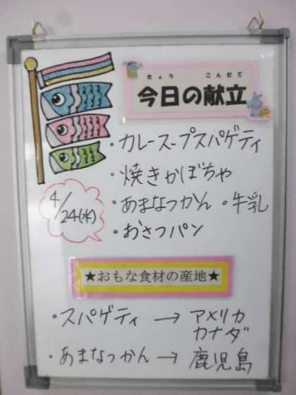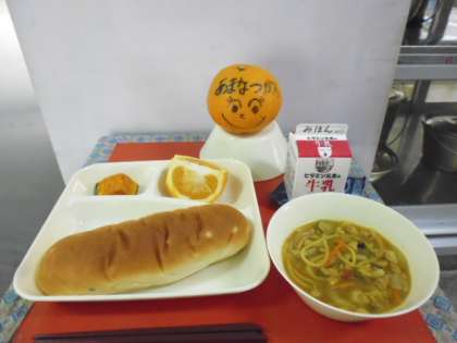 ★4月24日(水)の給食は、 ・カレースープスパゲッティ ・焼きかぼちゃ ・あまなつかん ・おさつパン ・牛乳です。
