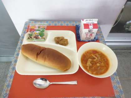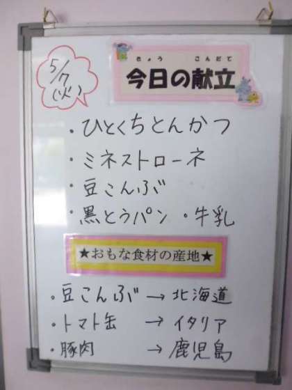 ★5月7日(火)の給食は、 ・一口とんかつ ・ミネストローネ ・豆こんぶ ・黒糖パン ・牛乳です。